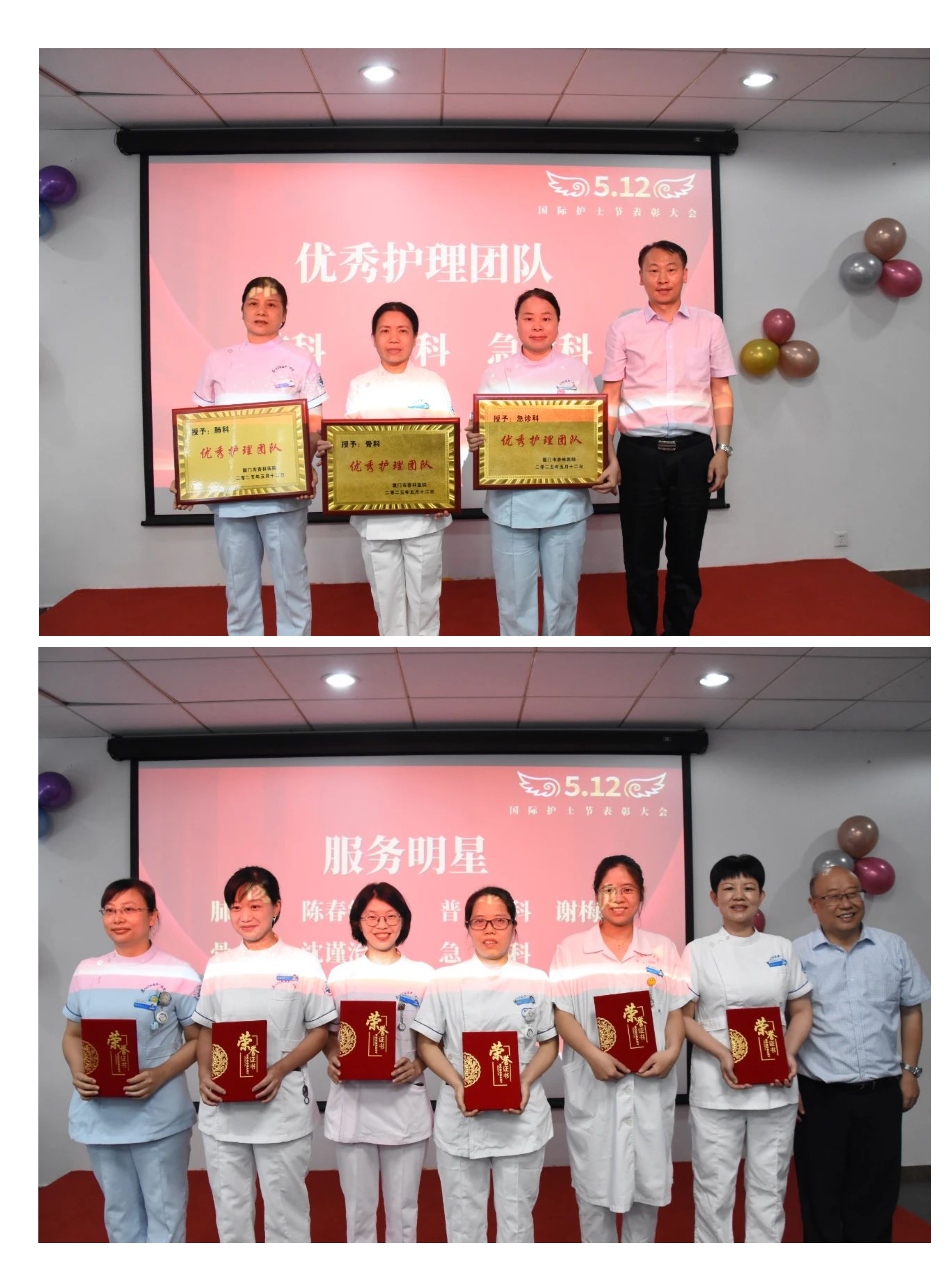 最后进行了大会的表彰环节,依次颁发了“优秀护理团队”“优秀护士长”“服务明星”“夜班天使”等8个奖项,共有39名护理人员获得表彰。